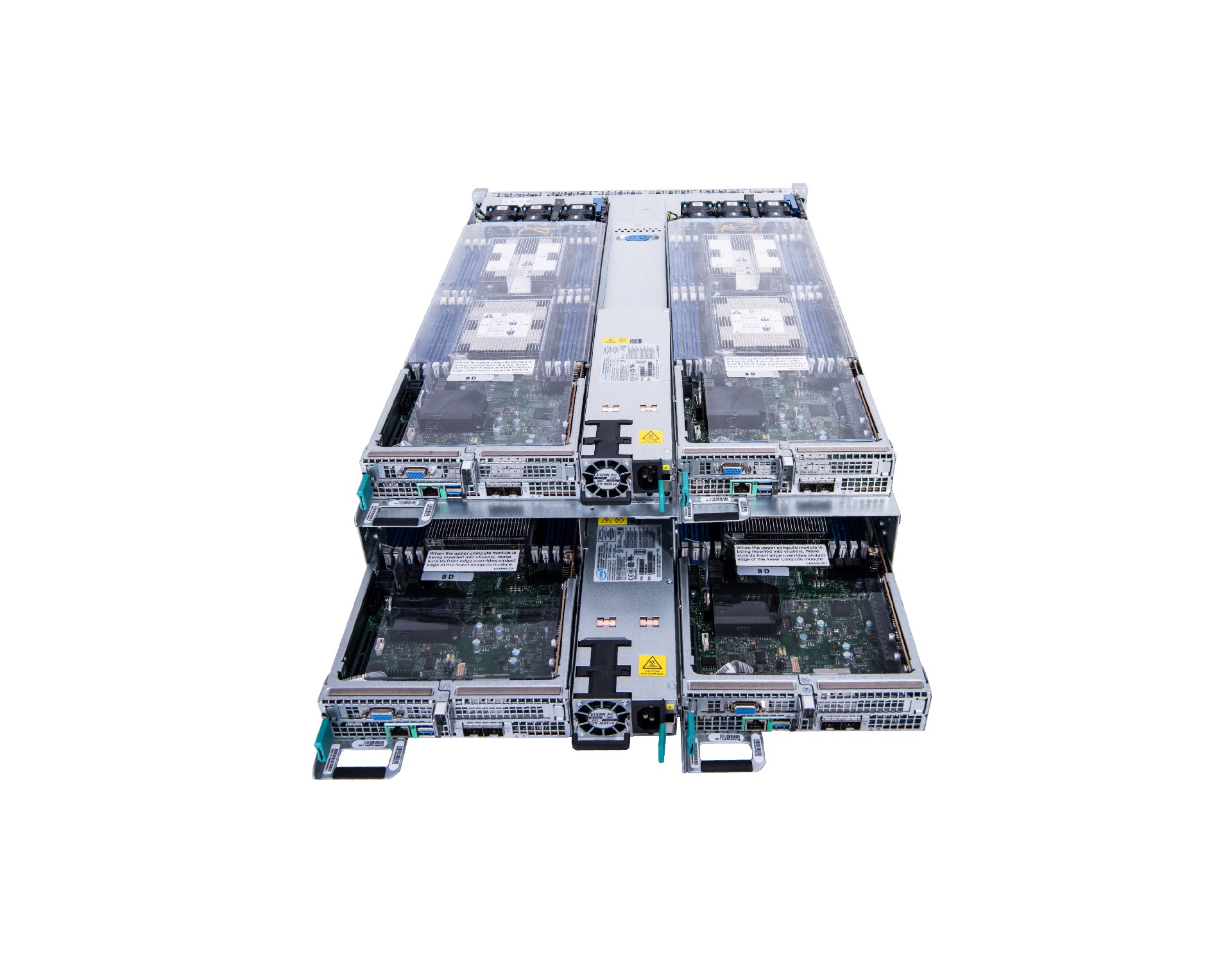 2U四節(jié)點(diǎn)服務(wù)器帶有中央散熱風(fēng)扇和2個共享鉑金級熱插拔電源。